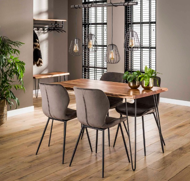 Indusztriális stílusú étkezőasztal, akácfa lappal, masszív porszórt acél lábakkal.